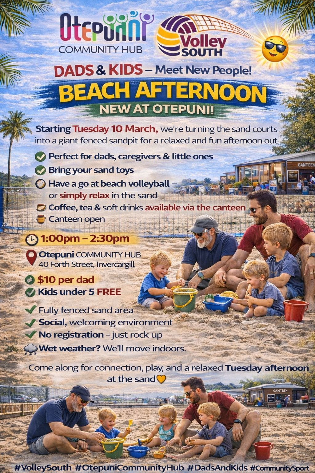 π¨βπ§βπ¦ DADS & KIDS (Under 5) β Meet New People!π BEACH AFTERNOON β NEW AT OTEPUNI!Starting Tuesday 10 March, weβre turning the sand courts into a giant fenced sandpit for a relaxed and fun afternoon out.
