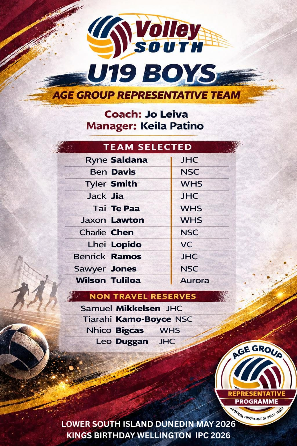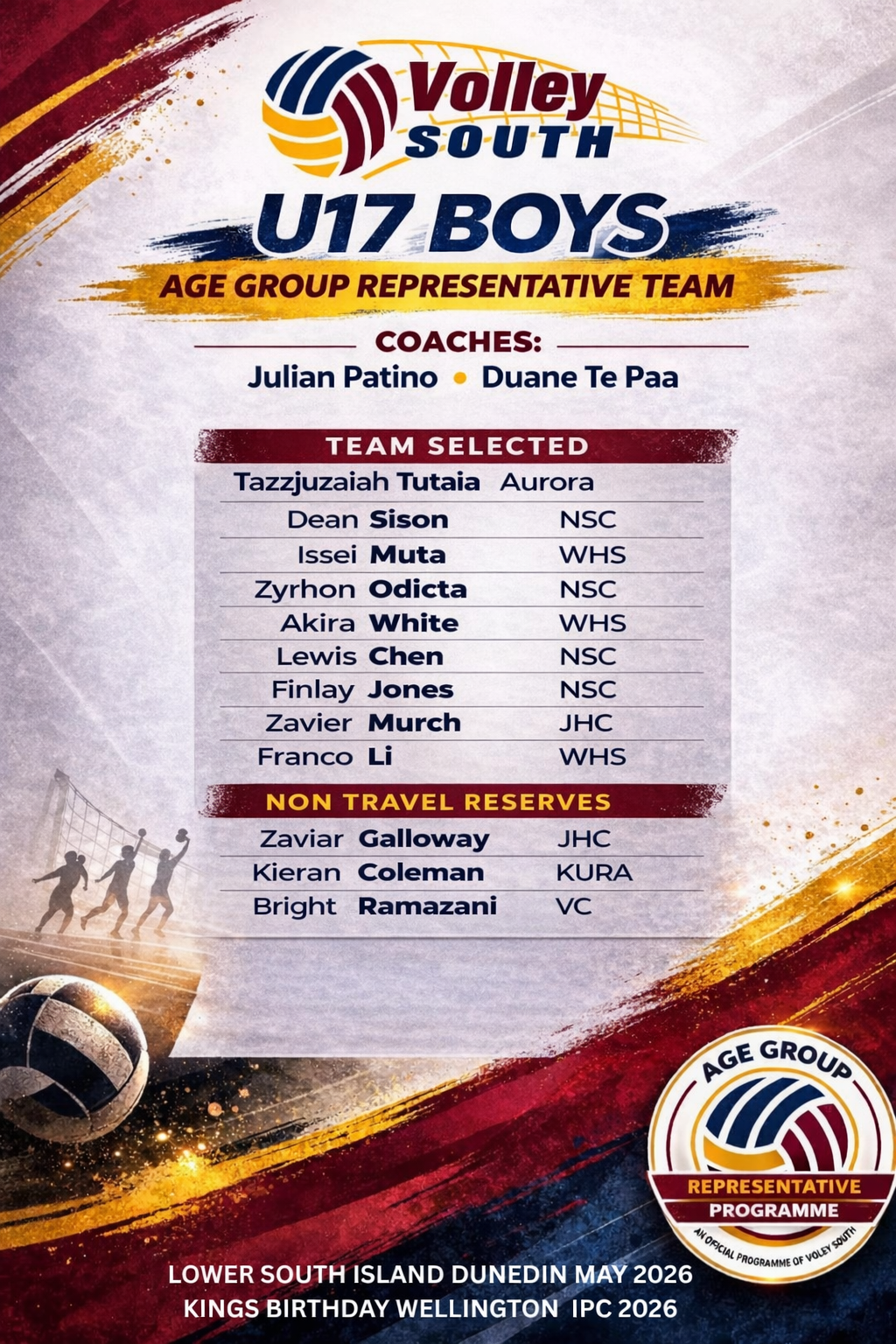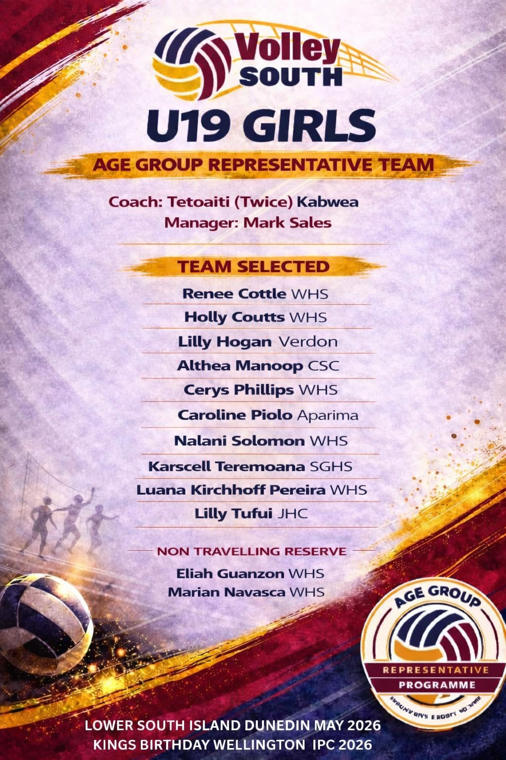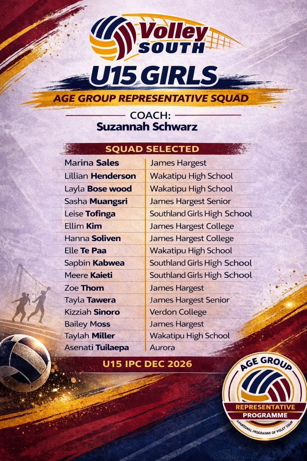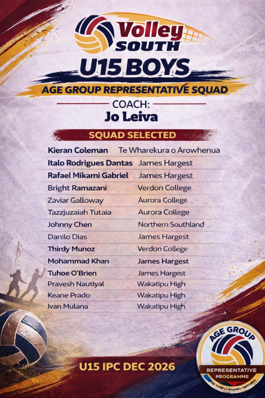 Announcement for the first time Volley South is looking to attend u15 IPC in Auckland - December 2026! Squads have been announced - see below!
