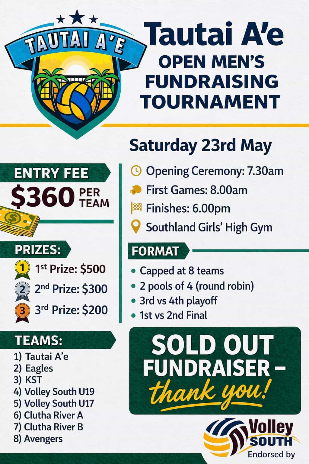 SOLD OUT IN MINUTES! Volley South is proud to endorse the Tautai A’e Open Men’s Fundraiser Tournament taking place on Saturday, 23 May
